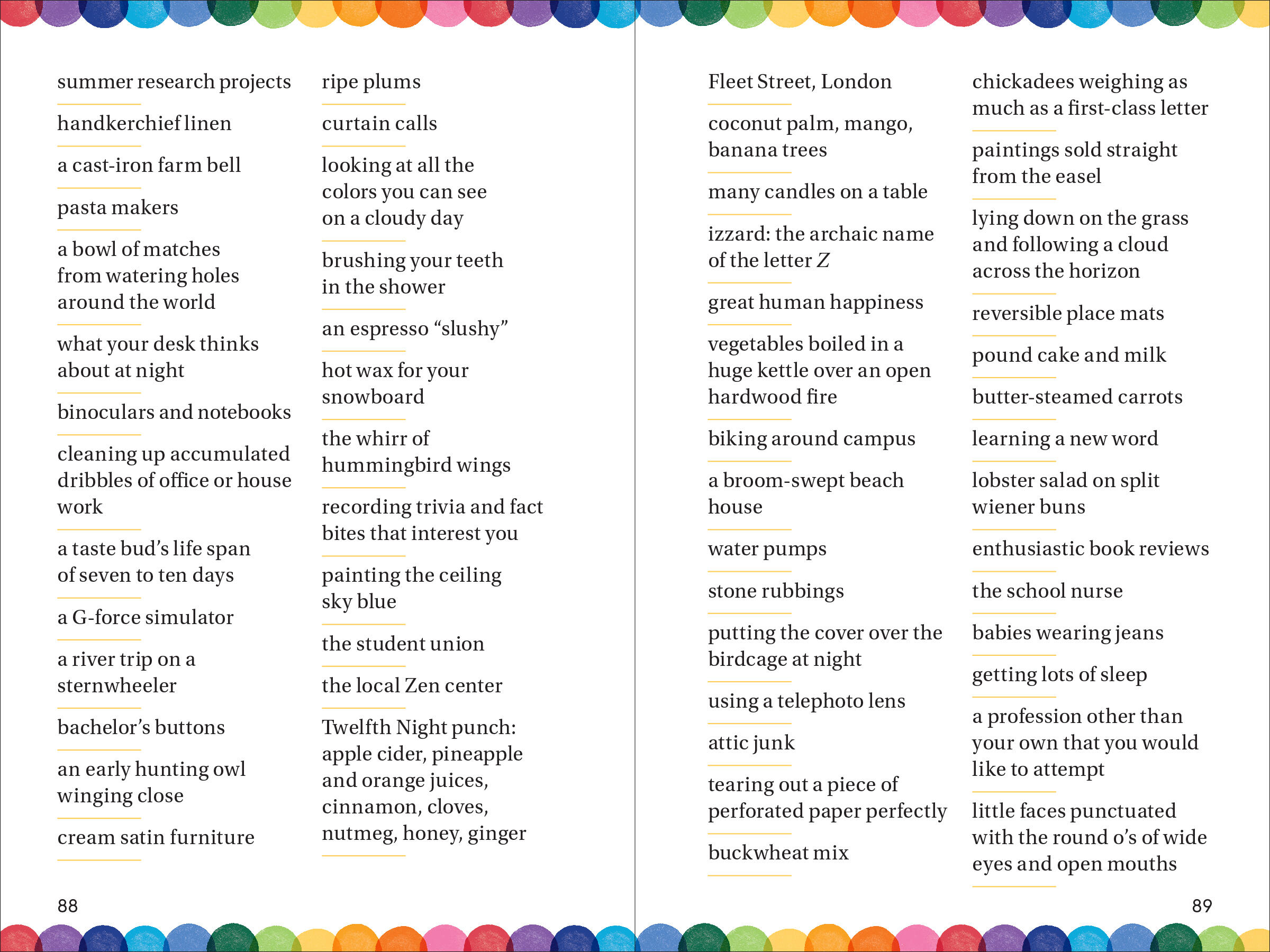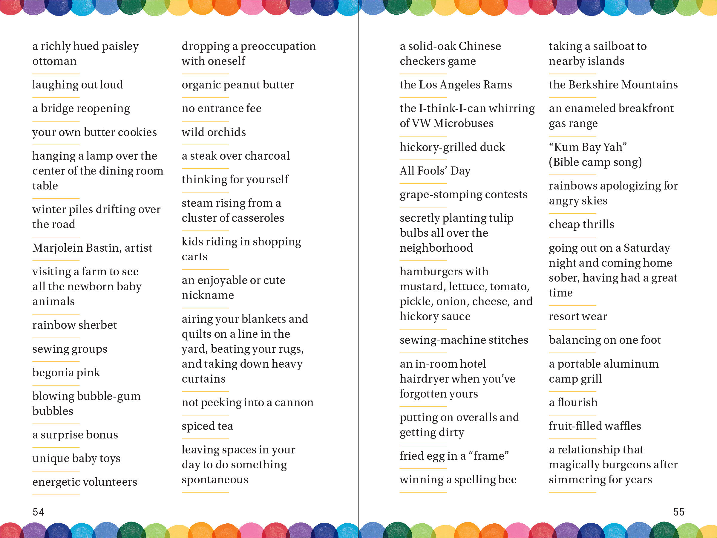 With more than 1.5 million copies in print, 14,000 Things to Be Happy About is the iconic impulse gift book that celebrates all the little things that make life worth living. Now it is even more of a mood-altering pick-me-up, with the use of cheerful watercolors throughout plus redesigned pages, all of which give this new edition a fresh, joyous feeling. At the heart, though, is its unique list of thousands of items, places, thoughts, and moments that make us happy. No opinions, no explanations, no asides or footnotes. It’s mesmerizing. And as an antidote to the all-too-many things to be unhappy about, it could not be more welcome.
