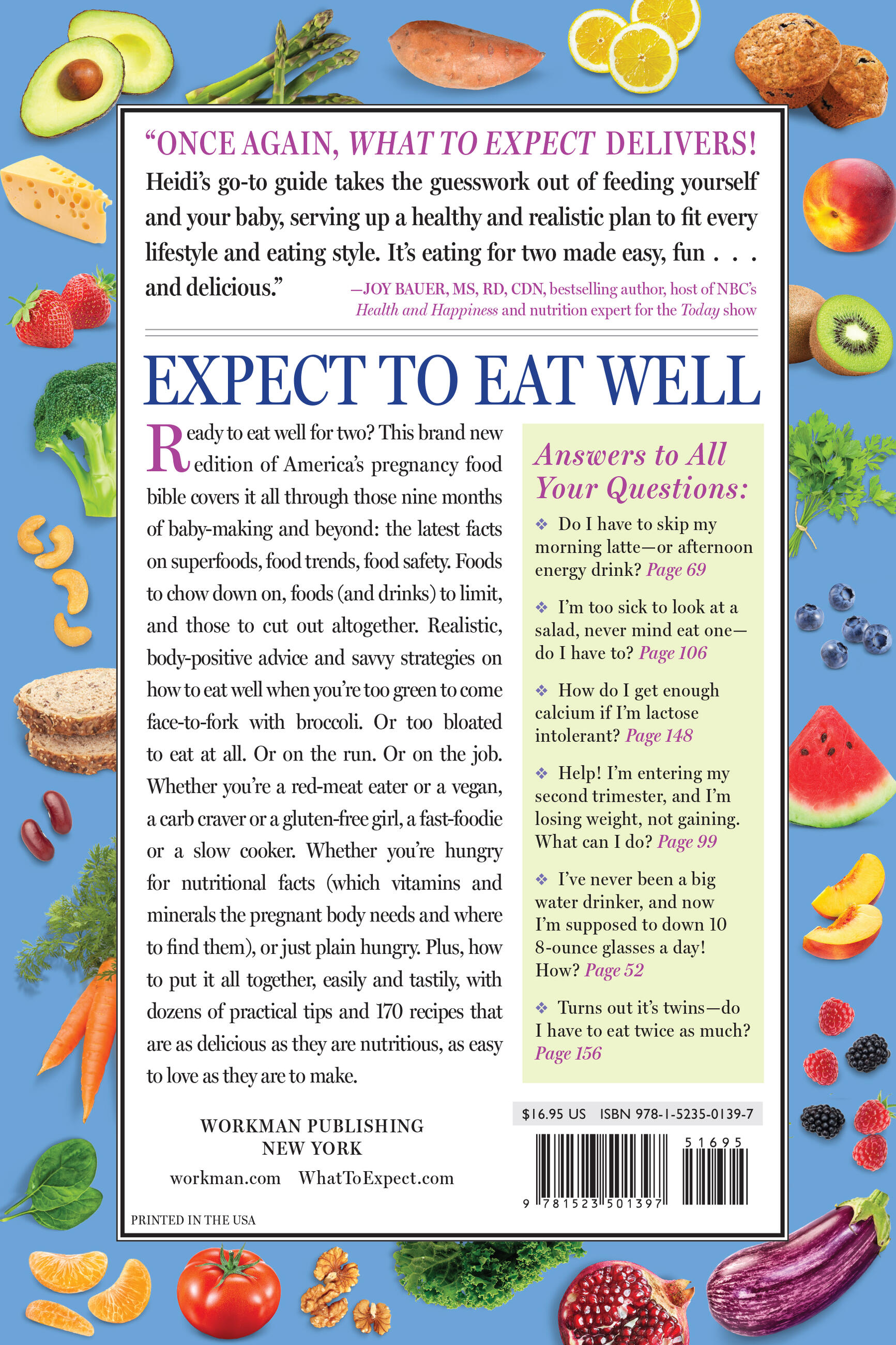 “Once again, What to Expect Delivers! Heidi’s go-to guide takes the guesswork out of feeding yourself and your baby, serving up a healthy and realistic plan to fit every lifestyle and eating style. It’s eating for two made easy, fun… and delicious.”––Joy Bauer, MS, RD, CDN, best-selling author, host of NBC’S Health and Happiness, and nutrition expert for the Today show