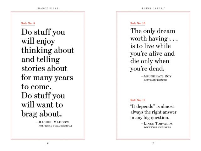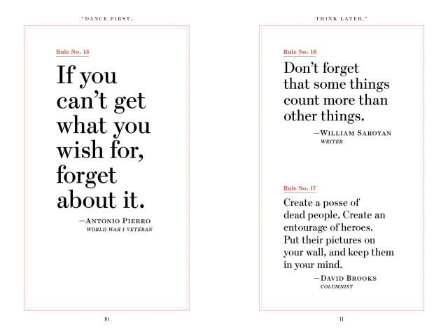 Created by Kathryn and Ross Petras, connoisseurs of quotes, whose books and calendars have over 56 million copies in print, “Dance First. Think Later.” is a collection of the greatest life wisdom from an unexpected group of speakers, doers, and thinkers. There are 618 rules to live by—funny, sly, declarative, thoughtful, offhanded, clever, and always profound: