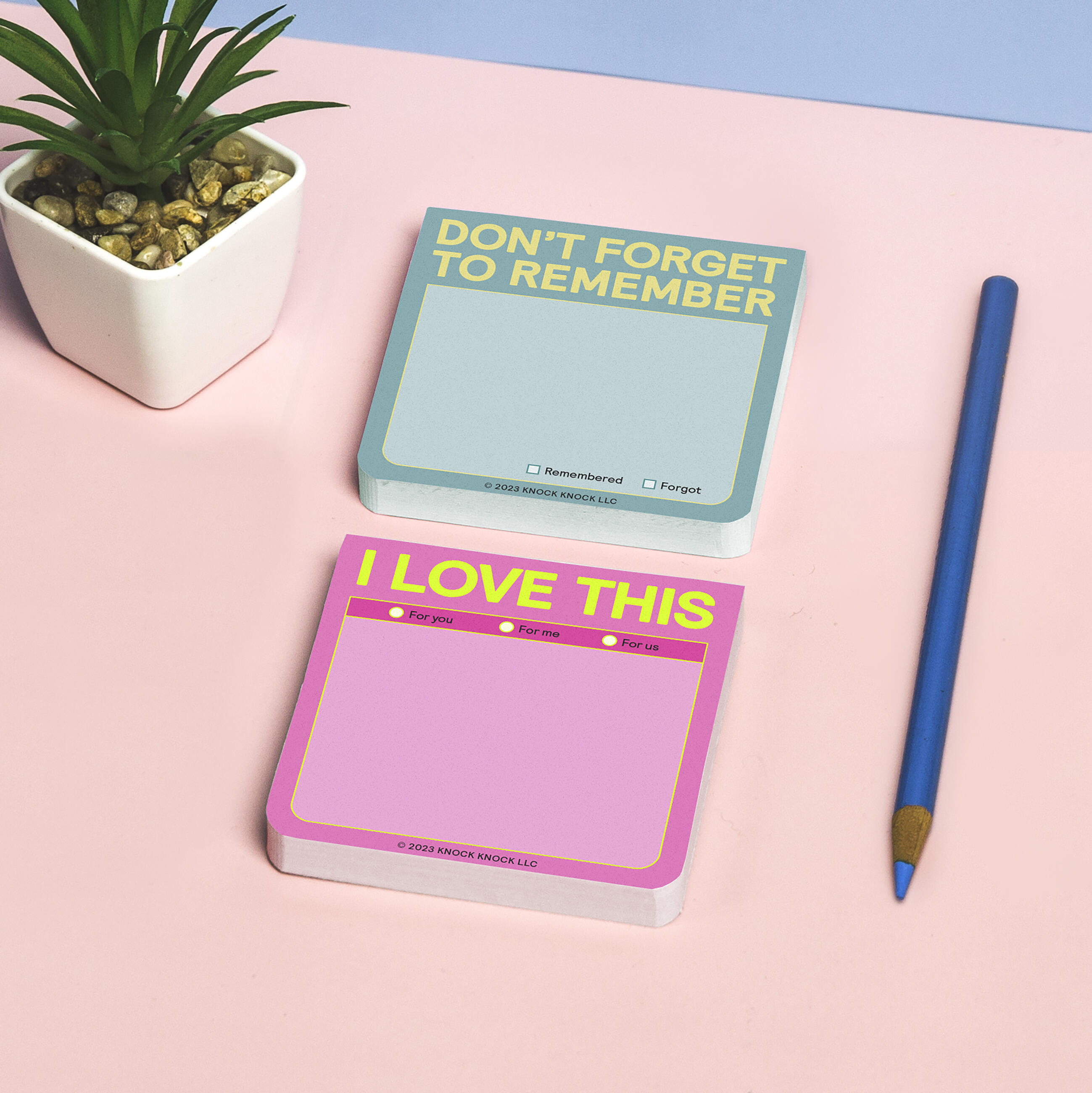 Use these colorful sticky notes to say “I love this,” write love notes, or simply jot your to-do list notes! Knock Knock sticky pads are down for whatever.