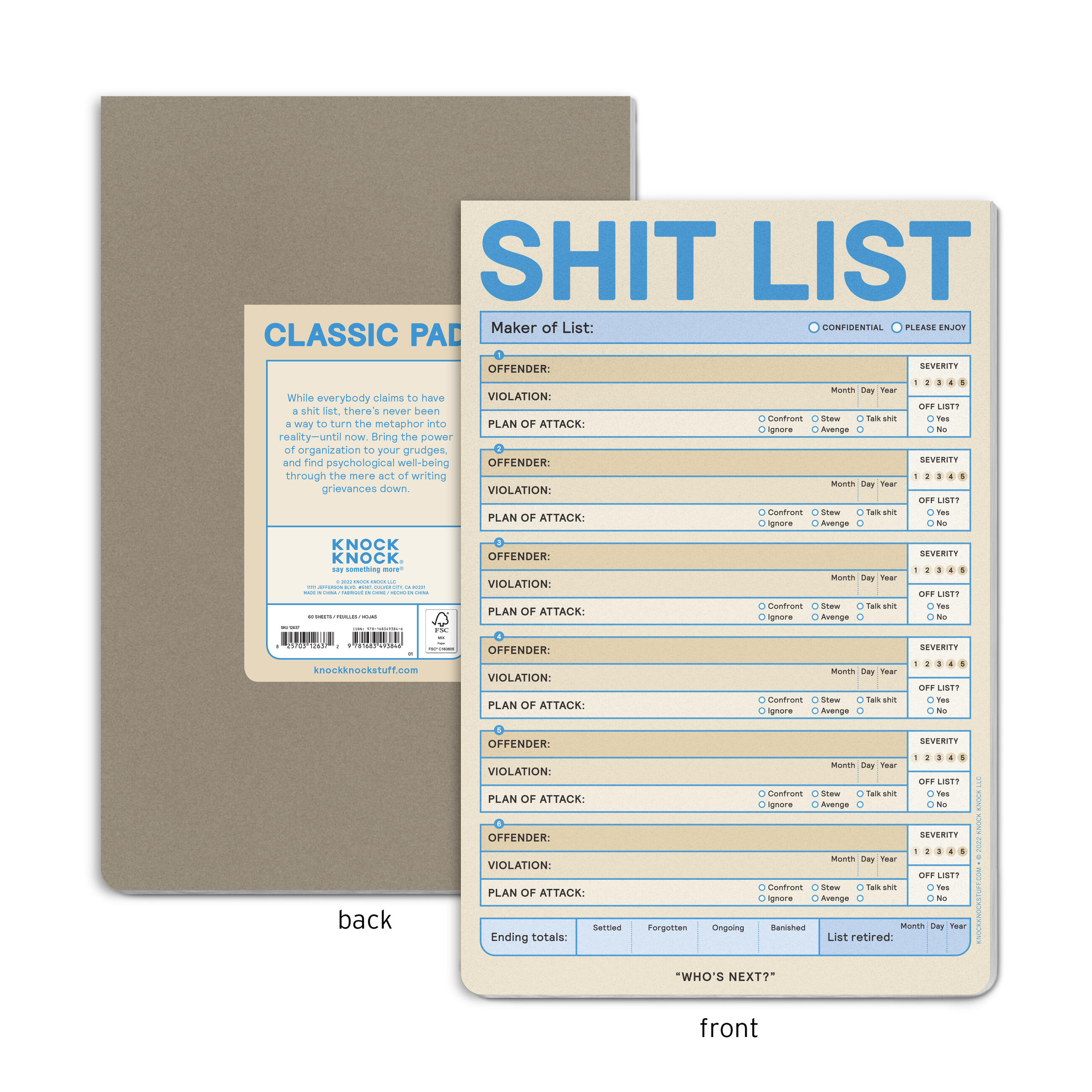 Everybody has a shit list in their head—now you can have one in your hands! This desk notepad lets you apply the organizational clarity of a spreadsheet to your many grudges, and discover psychological and emotional benefits of simply writing that shit down.