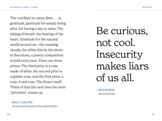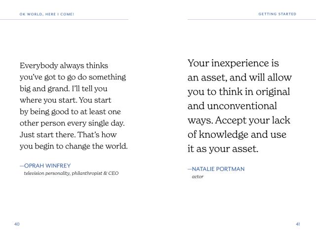 OK, World, Here I Come! is an invaluable book for graduates as they launch into the next chapter of life. Organized by themes such as Self-Care, Success & Failure, Work Ethic, and more, each quote is carefully selected to evoke confidence, motivation, and encouragement for the reader.