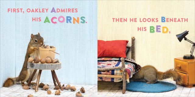 Oakley the Squirrel: The Search for Z is an alphabet book like no other. In it, we meet Little Oakley as he embarks on a quest to find the letter Z. He searches through an alphabet of human objects—looks beneath the Bed, claws through the Closet, digs through Drawers, examines his Easel, and so on. By the time he gets to a basket of yarn, Oakley starts to yawn, and soon falls asleep. And Z—as in, Zzzzzz!—appears!