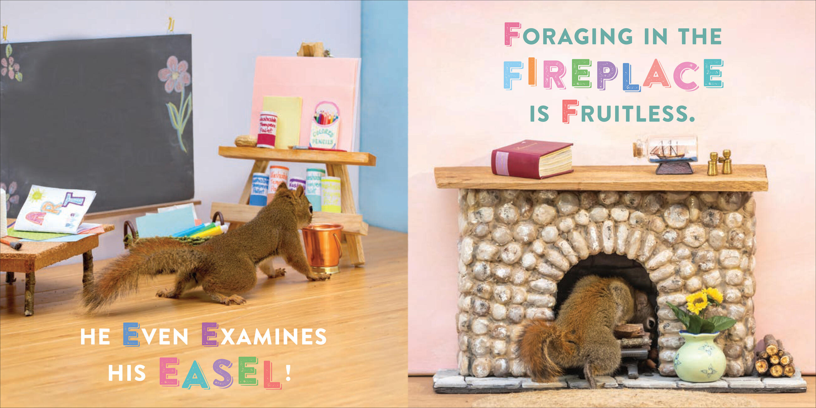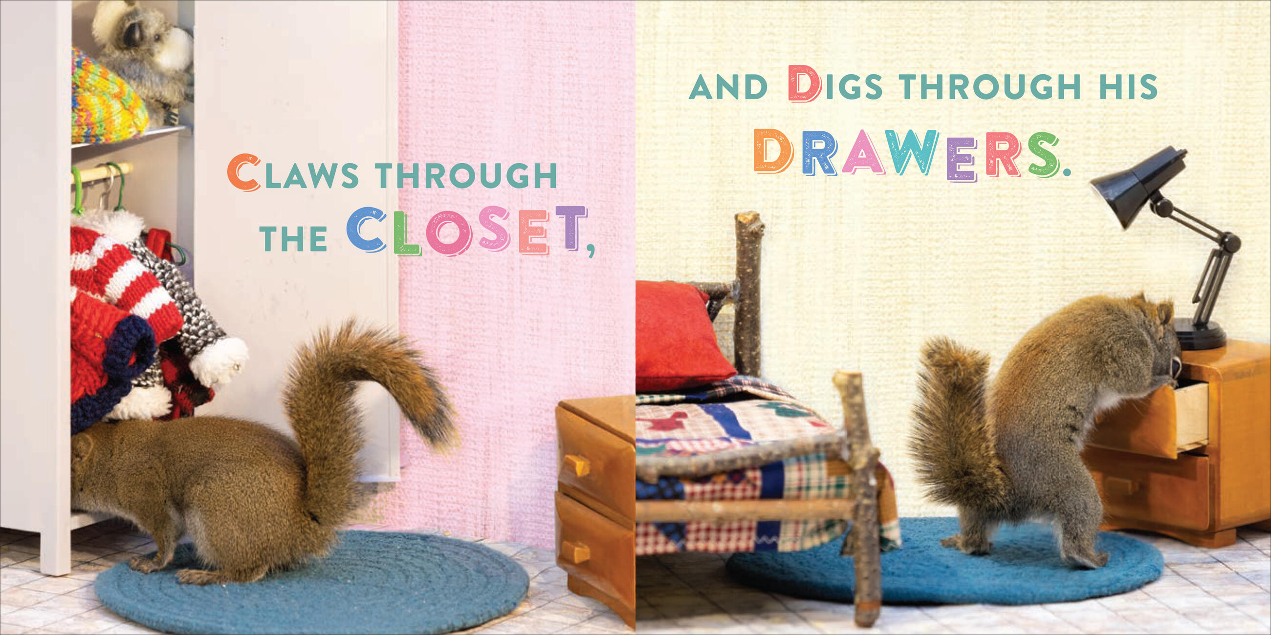 Every page features photos of real squirrels—no photoshopping! Photographer Nancy Rose lures squirrels into her photo frame using strategically placed peanuts, so they appear in squirrel-sized sets that replicate indoor human life, complete with beds, hats, dining tables and food, laundry machines, campers, and more. It’s irresistible!