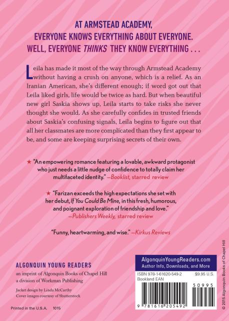 Leila has made it most of the way through Armstead Academy without having a crush on anyone, which is a relief. As an Iranian American, she’s different enough; if word got out that Leila liked girls, life would be twice as hard. But when beautiful new girl Saskia shows up, Leila starts to take risks she never thought she would. As she carefully confides in trusted friends about Saskia’s confusing signals, Leila begins to figure out that all her classmates are more complicated than they first appear to be, and some are keeping surprising secrets of their own