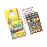 The fold-out portfolio features 10 pages of colorful sticker backgrounds on a wire-o pad. Budding child designers use a sturdy plastic stencil and the hundreds of colorful stickers and 3-D gemstone stickers to finish the designs. The finished works of art can then be peeled out of the pad and placed on any sticker-friendly surface to create unique works of art.