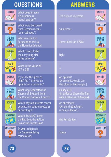 - 1,500 questions and answers covering math, science, English, history, geography, and more