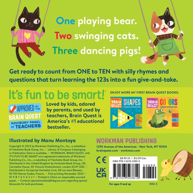 My First Brain Quest: 123s is a delightful counting book that introduces the numbers one through ten. Each number is presented in a variety of ways: number name, numerals, and objects. Bright, fun images, rhyming text, and engaging questions help young learners to count, discuss observations, and build on prior knowledge. Smart, colorful, grounded in educational principles, and reviewed by a panel of early learning experts, this board book introduces numbers in a fun, engaging way.