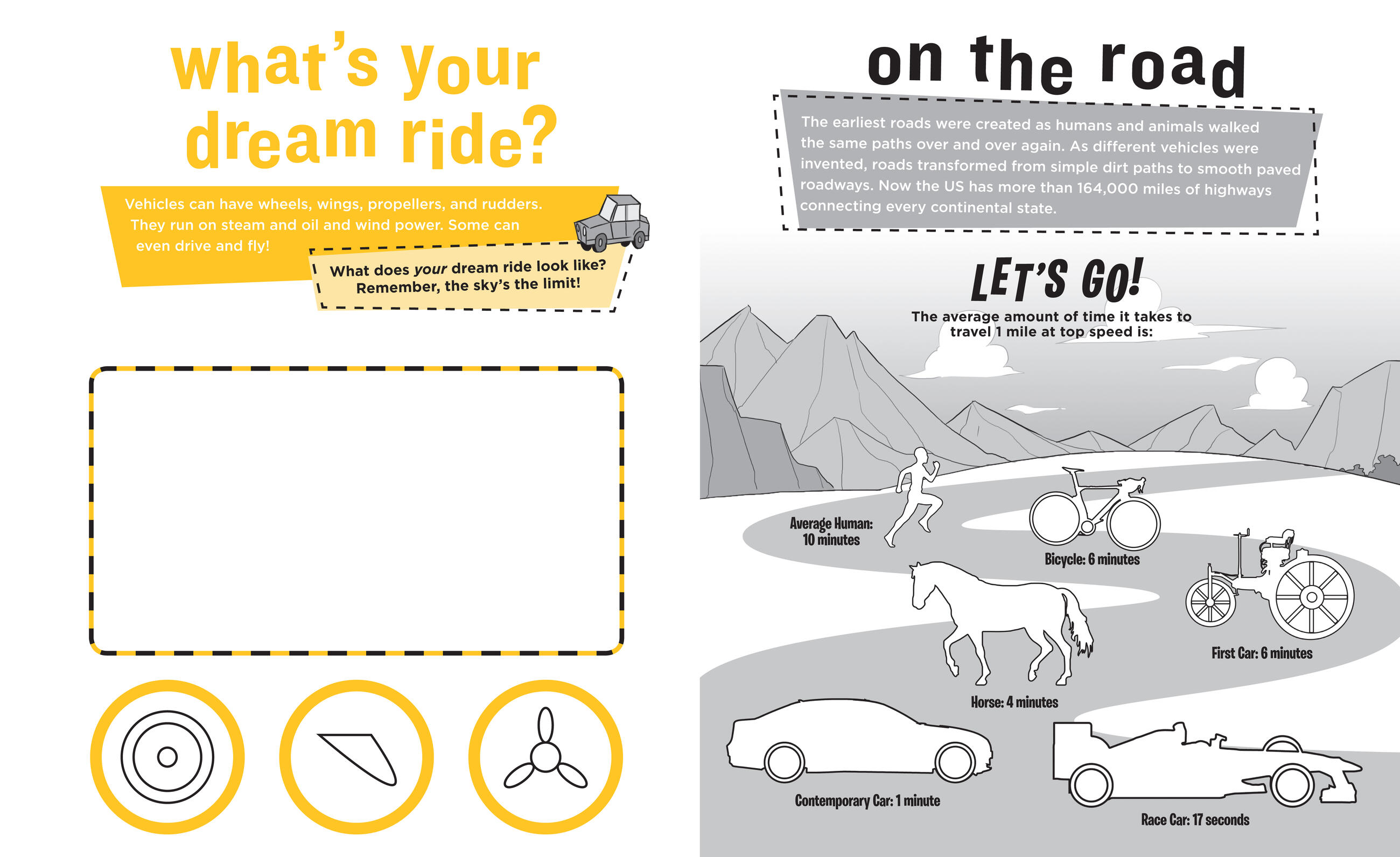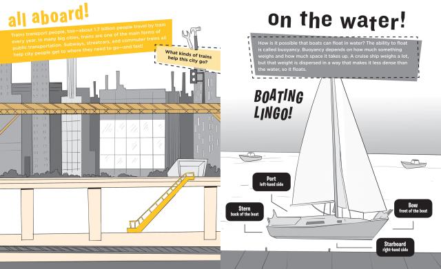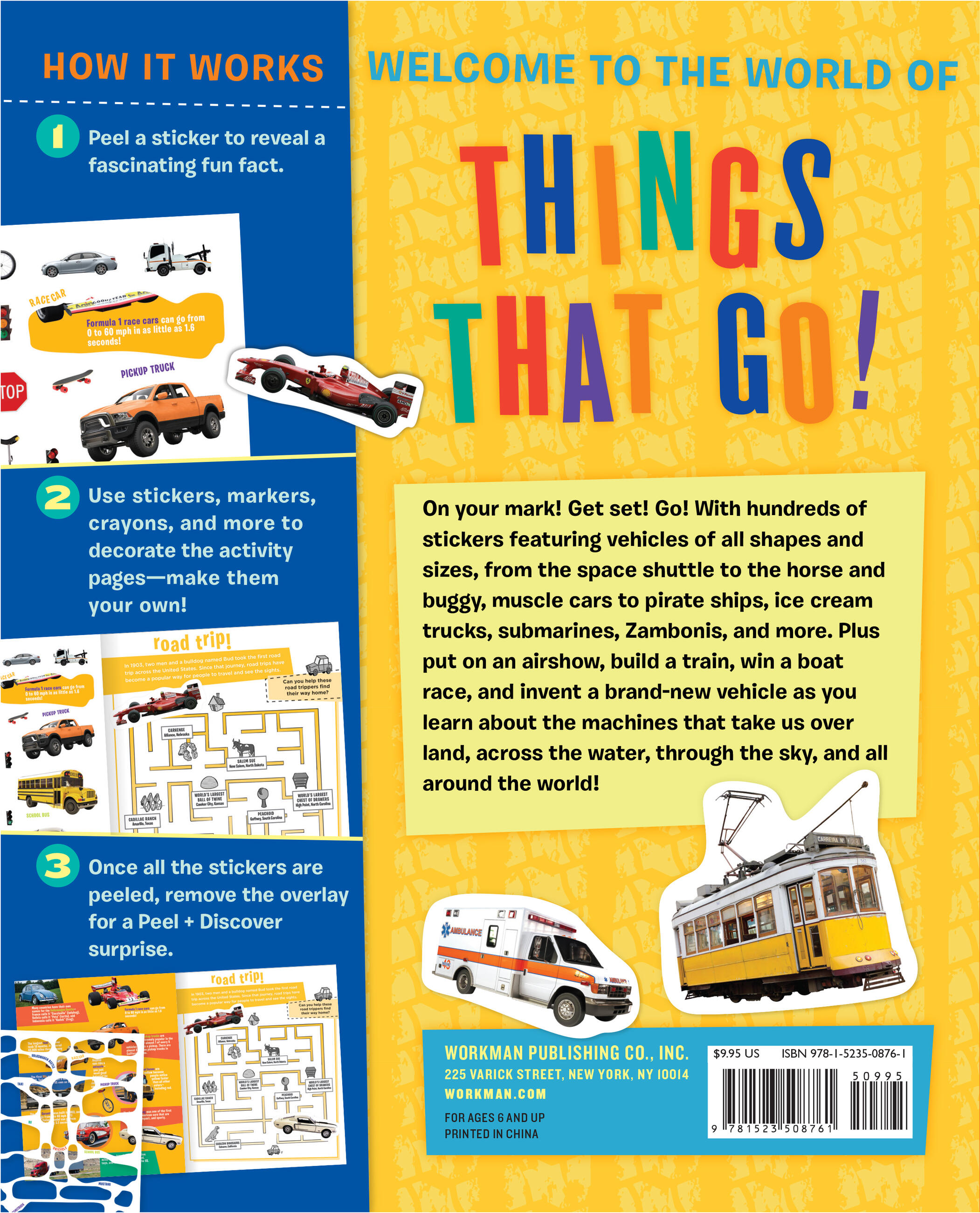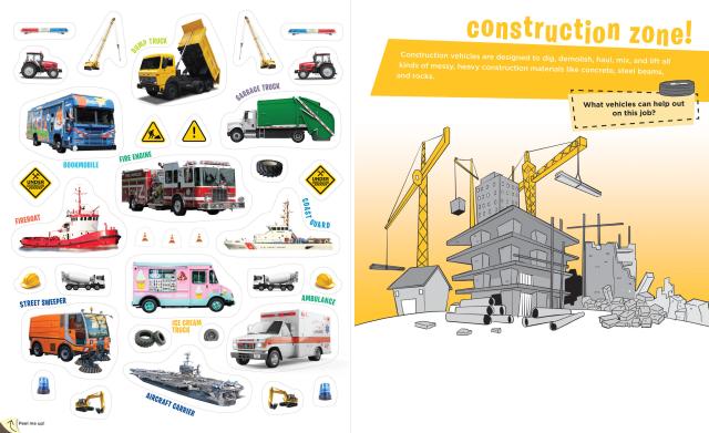 On your mark! Get set! Go! With hundreds of stickers featuring vehicles of all shapes and sizes, from the space shuttle to the horse and buggy, muscle cars to pirate ships, ice cream trucks, submarines, Zambonis, and more. Plus, put on an airshow, build a train, win a boat race, and invent a brand-new vehicle as you learn about the machines that take us over land, across the water, through the sky, and all around the world!